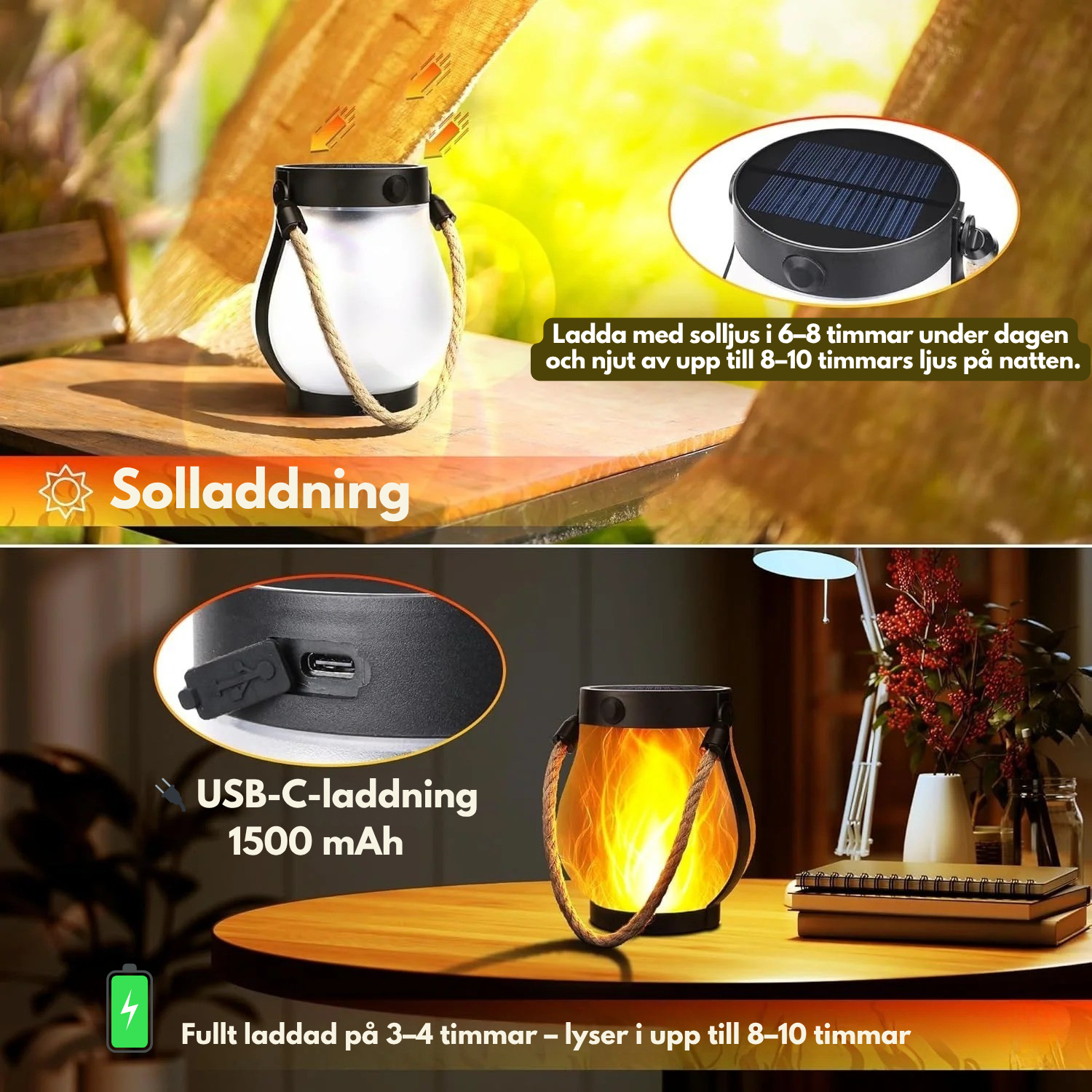 En kylig kväll, en filt över axlarna, och ett mjukt fladdrande sken som ser ut som riktig eld. NordFlame™ ger dig lägereldskänslan – utan rök, utan risk, utan sladdar. Tack vare solpanel + USB-C-snabbladdning har du alltid ljus när det behövs, i trädgården, på balkongen, i sommarstugan eller på campingen.